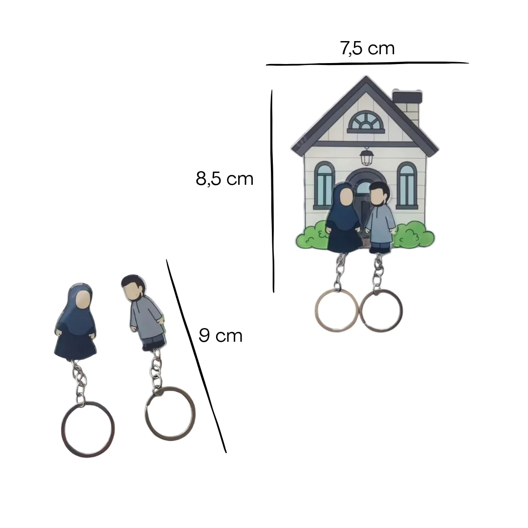 The package includes the key holder, one keychain for the woman, one keychain for the man, and the fixing elements for easy installation.